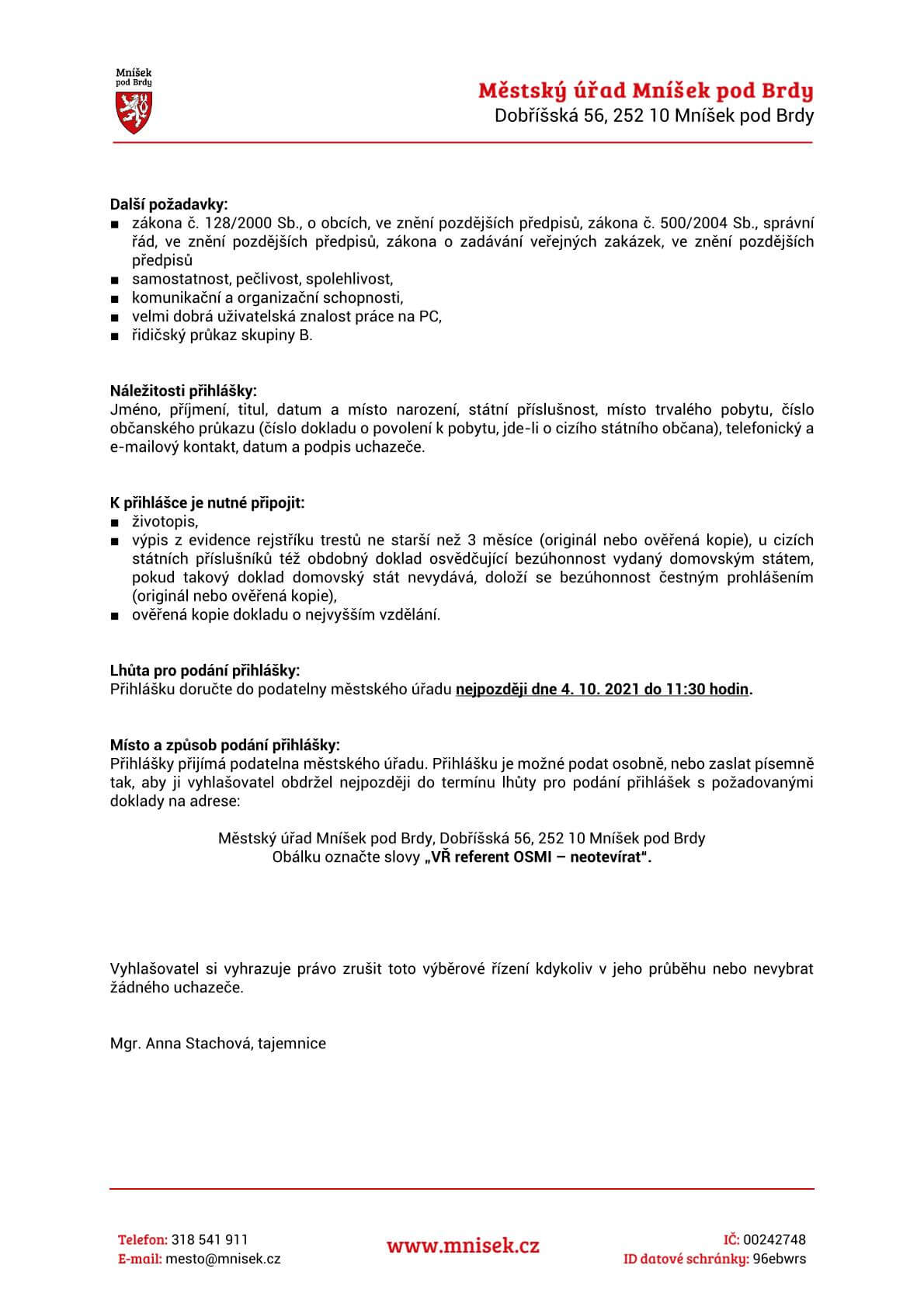 MěÚ Mníšek pod Brdy přijme nového kolegu/kolegyni na pozici REFERENT/KA ODBORU SPRÁVY MAJETKU A INVESTIC