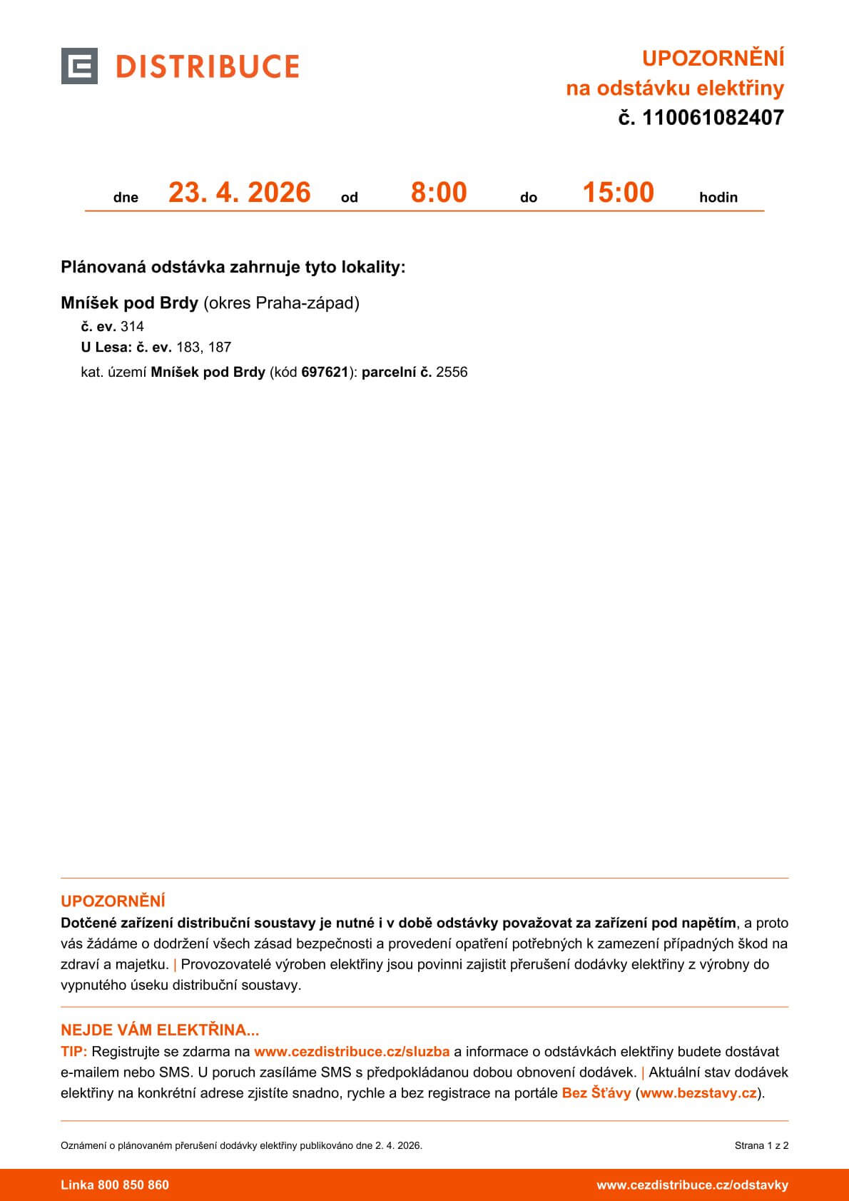 V úterý 14. dubna dojde k plánované odstávce elektrické energie od 7:30 do 14:30.