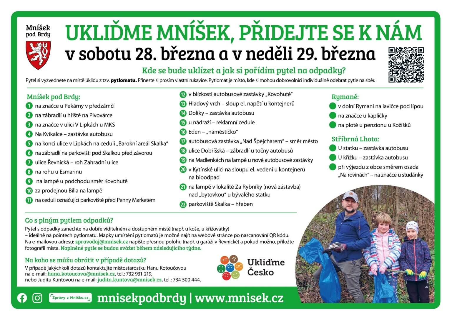 Vyberete si z výše uvedených lokalit jednu, která vám nejlépe vyhovuje. Na místě najdete pytlomat, ze kterého si vezmete pevný pytel na odpadky. Po naplnění odneste pytel na dobře viditelné místo např. u odpadkového koše nebo u křižovatky, vyfoťte místo s pytlem a fotku i s nahlášením jeho polohy, kde jste ho nechali (např. u hřbitova, u garáží v Řevnické, v Rymani u penzionu), pošlete na e-mail zpravodaj@mnisek.cz.