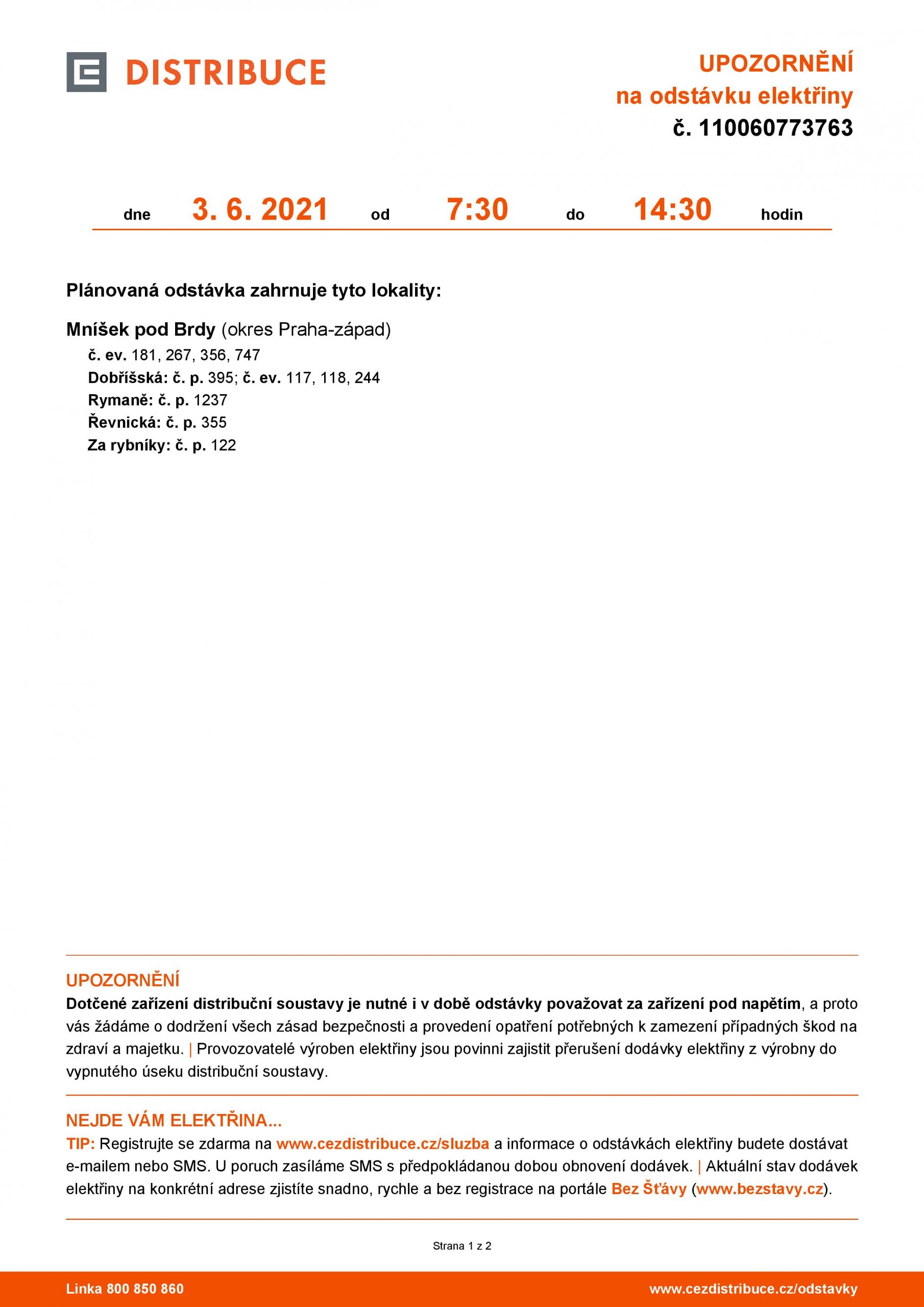 Ve čtvrtek 3. června 2021 mezi 7:30 a 14:30 dojde k plánovanému přerušení dodávky elektřiny.