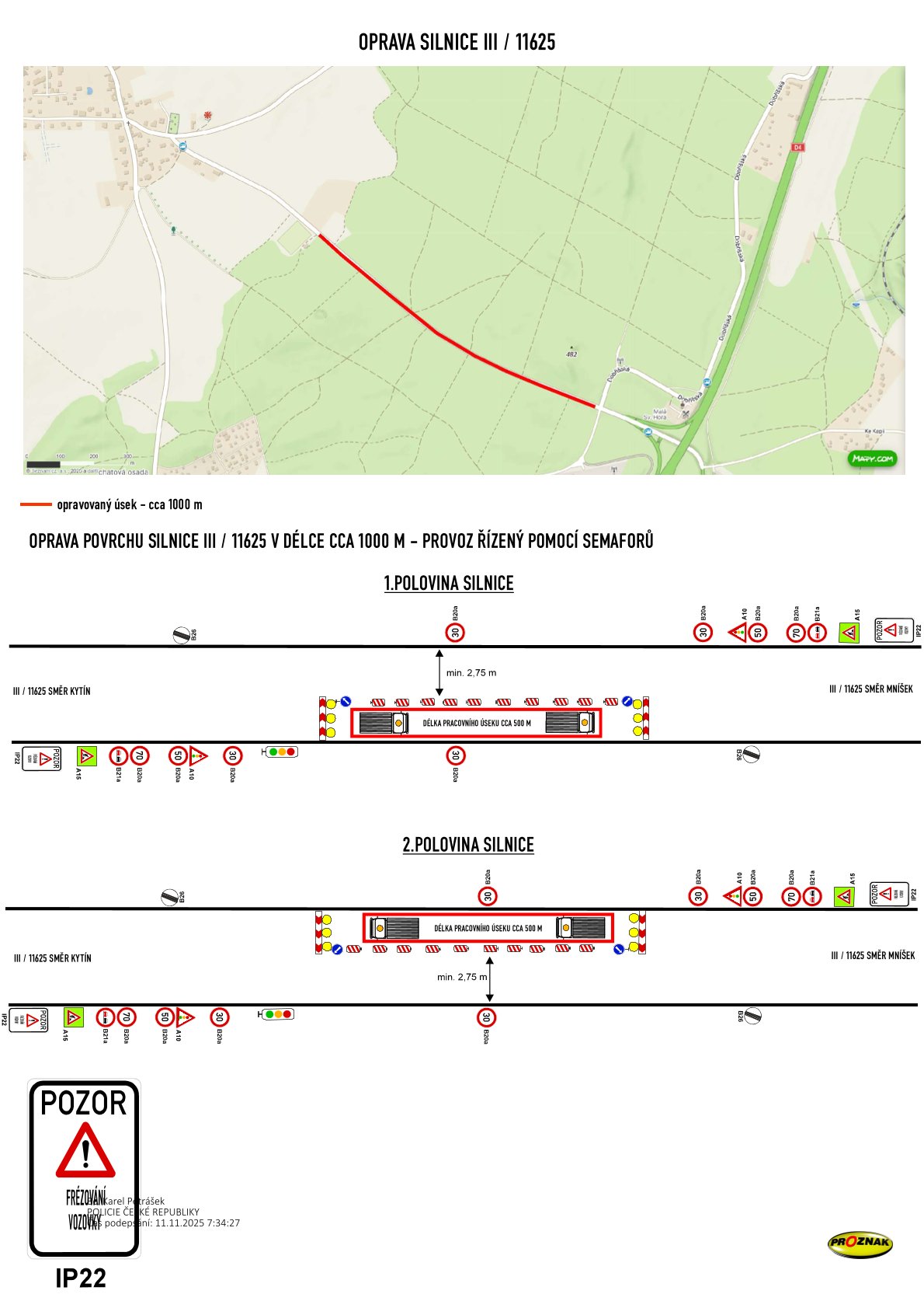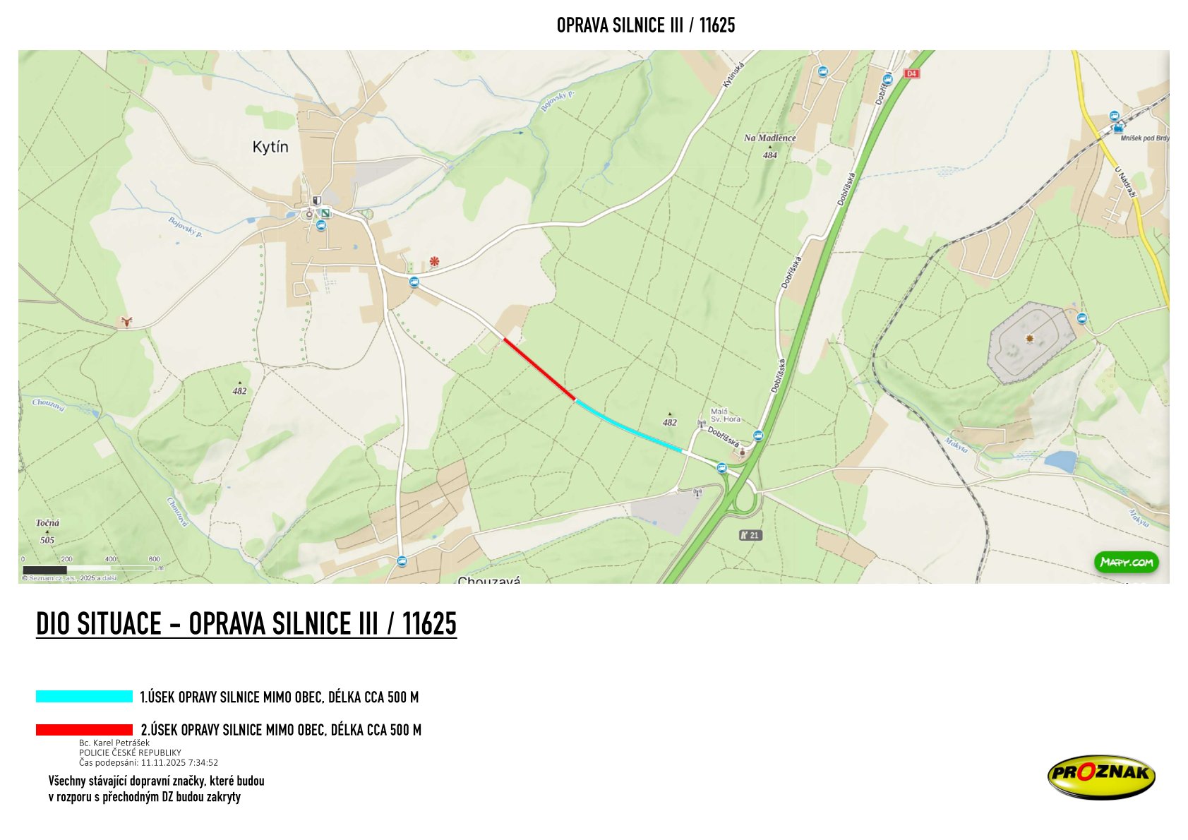 V termínu od 25. listopadu do 7. prosince 2025 bude opravován povrch silnice č. III/11625 – úsek o délce 1 kilometr od křižovatky se silnicí č. III/11626 (křižovatka směr Malá Svatá Hora) směrem do Kytína až k fotbalovému hřišti.