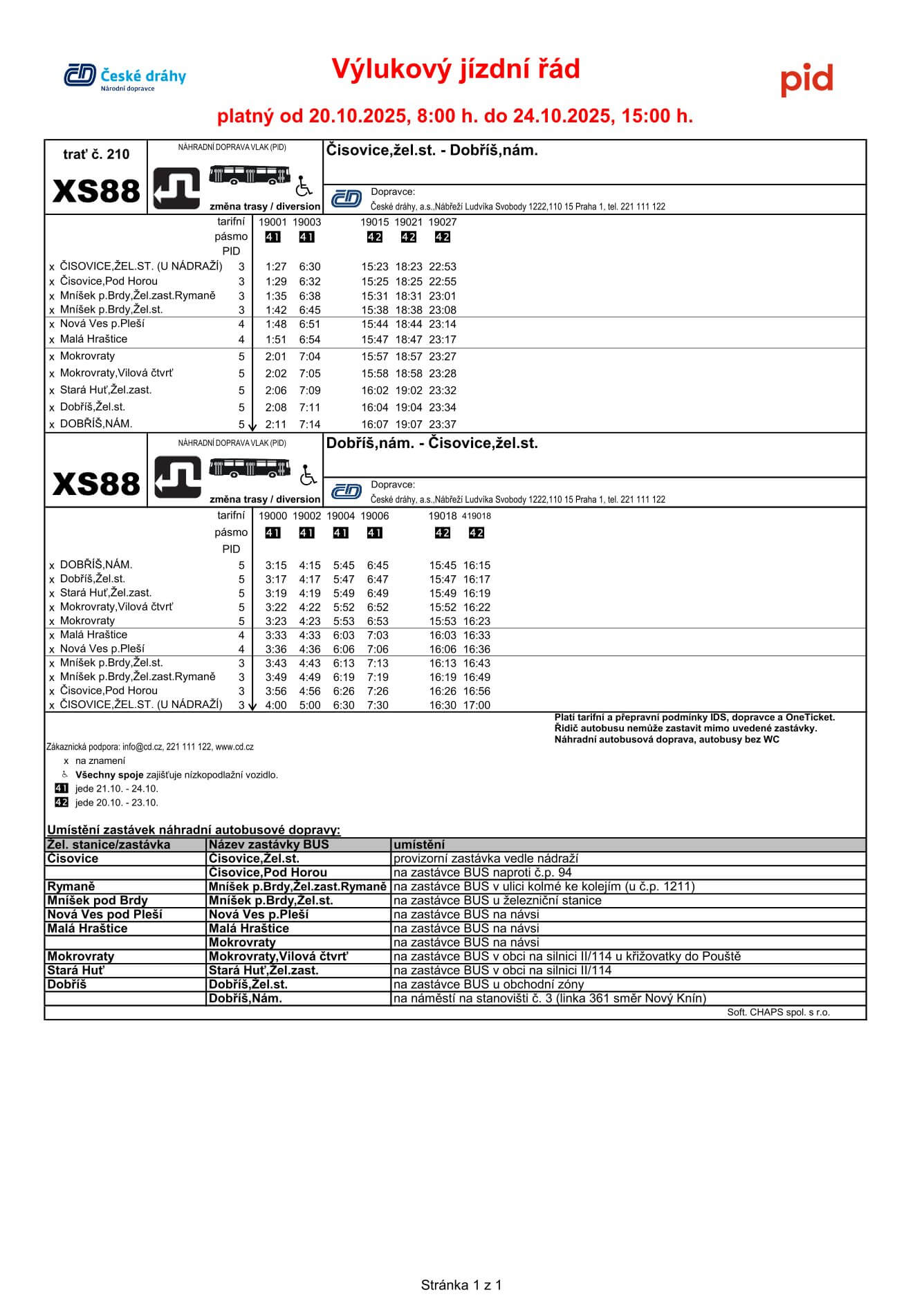 V termínu od pondělí 20. října (od 8:00) do pátku 24. října (do 15:00) dojde k výluce vlakové dopravy na trati mezi Dobříší a Čisovicemi.