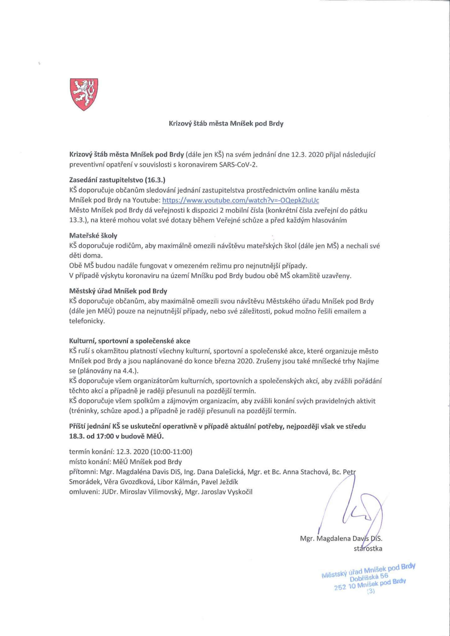 Krizový štáb města Mníšek pod Brdy (dále jen KŠ) na svém jednání dne 12.3. 2020 přijal následující preventivní opatření v souvislosti s koronavirem SARS-CoV-2.