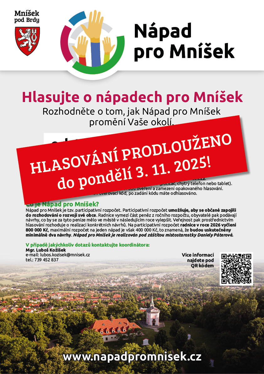Samozřejmě myslíme i na ty, kteří nejsou zvyklí pracovat s počítačem ani internetem. Ti mohou kontaktovat koordinátora Nápadu pro Mníšek Luboše Kožíška (tel.: 739 452 837, e-mail: lubos.kozisek@mnisek.cz), který jim s hlasováním pomůže. S hlasováním vám pomůžeme také, pokud dorazíte v sobotu 18. října mezi 9. a 15. hodinou do Předzámčí na trhy NAJÍME SE do městského informačního stánku. Nezapomeňte si s sebou vzít mobilní telefon.