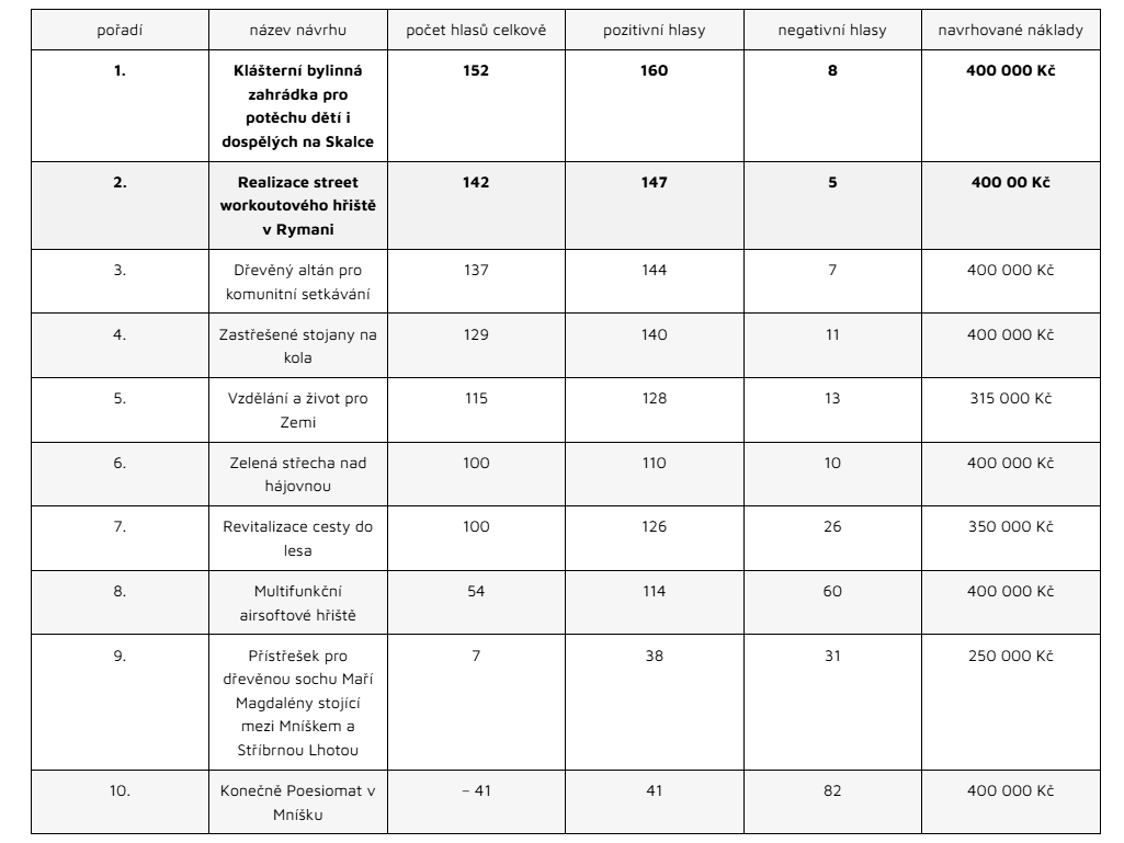 Nejúspěšnějším návrhem s počtem 152 hlasů se stala Klášterní bylinná zahrádka pro potěchu dětí i dospělých na Skalce v těsném závěsu za ním skončila Realizace street workoutového hřiště v Rymani s 142 hlasy.